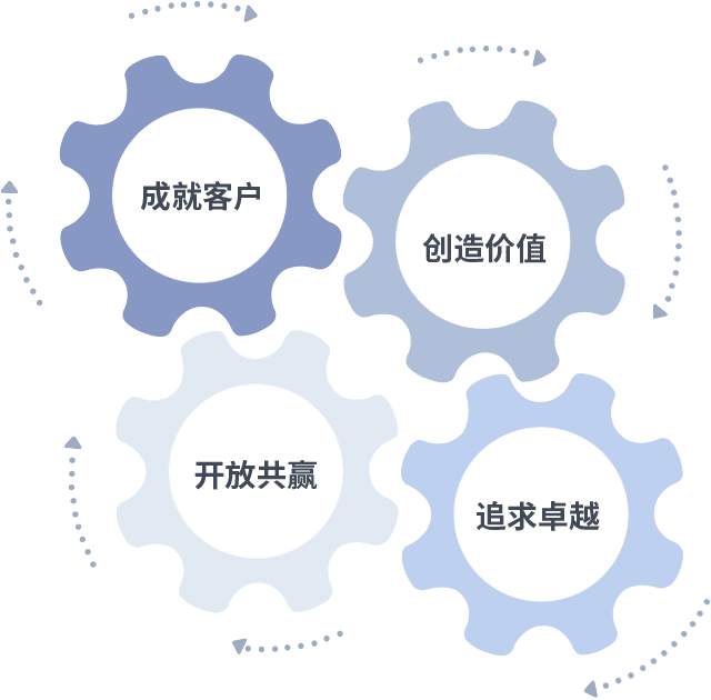 成就客户是一切决策的出发点,,创造价值是衡量所有工作的标准,,,追求卓越是我们做事做人的态度,,,开放共赢是我们的格局也是最终的结果。。价值观的齿轮环环相扣,,,推动着组织里的每个人不断向前。。